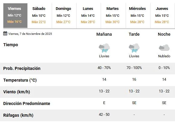 El Servicio Meteorológico Nacional (SMN) anunció para este 7 de noviembre una temperatura mínima de 12°C y una máxima que rondará en los 16 °C.