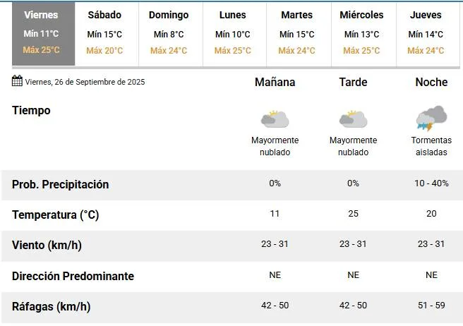 Viernes con tiempo inestable en la ciudad. Se prevé cielo mayormente nublado en la mañana y tarde y tormentas aisladas en la noche. El Servicio Meteorológico Nacional (SMN) anunció para este 26 de septiembre una temperatura mínima de 11 °C y una máxima que rondará en los 25 °C.
