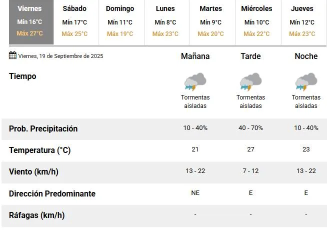 El Servicio Meteorológico Nacional (SMN) anunció para este 19 de septiembre una temperatura mínima de 16 °C y una máxima rondará en los 27 °C