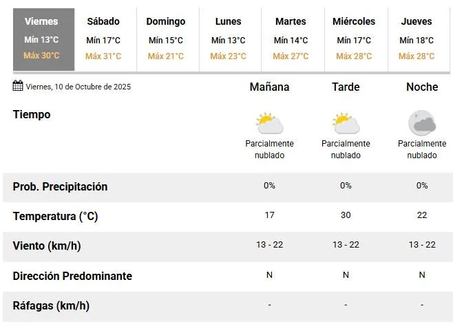 Viernes feriado y con calor en la ciudad. El Servicio Meteorológico Nacional (SMN) anunció para este 10 de octubre una temperatura mínima de 13 °C y una máxima que llegará a los 30 °C.