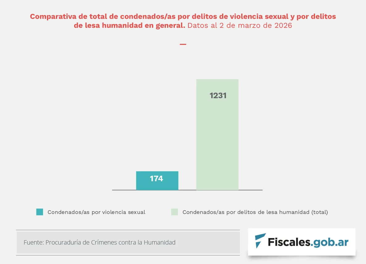 En términos de responsables, las condenas por estos crímenes alcanzan a 174 personas, dentro de un universo de 1231 condenados desde la reapertura de los procesos judiciales. Las víctimas identificadas en las sentencias son 230 mujeres y 40 varones, víctimas de un abanico de conductas que el derecho tipifica como agresiones sexuales.