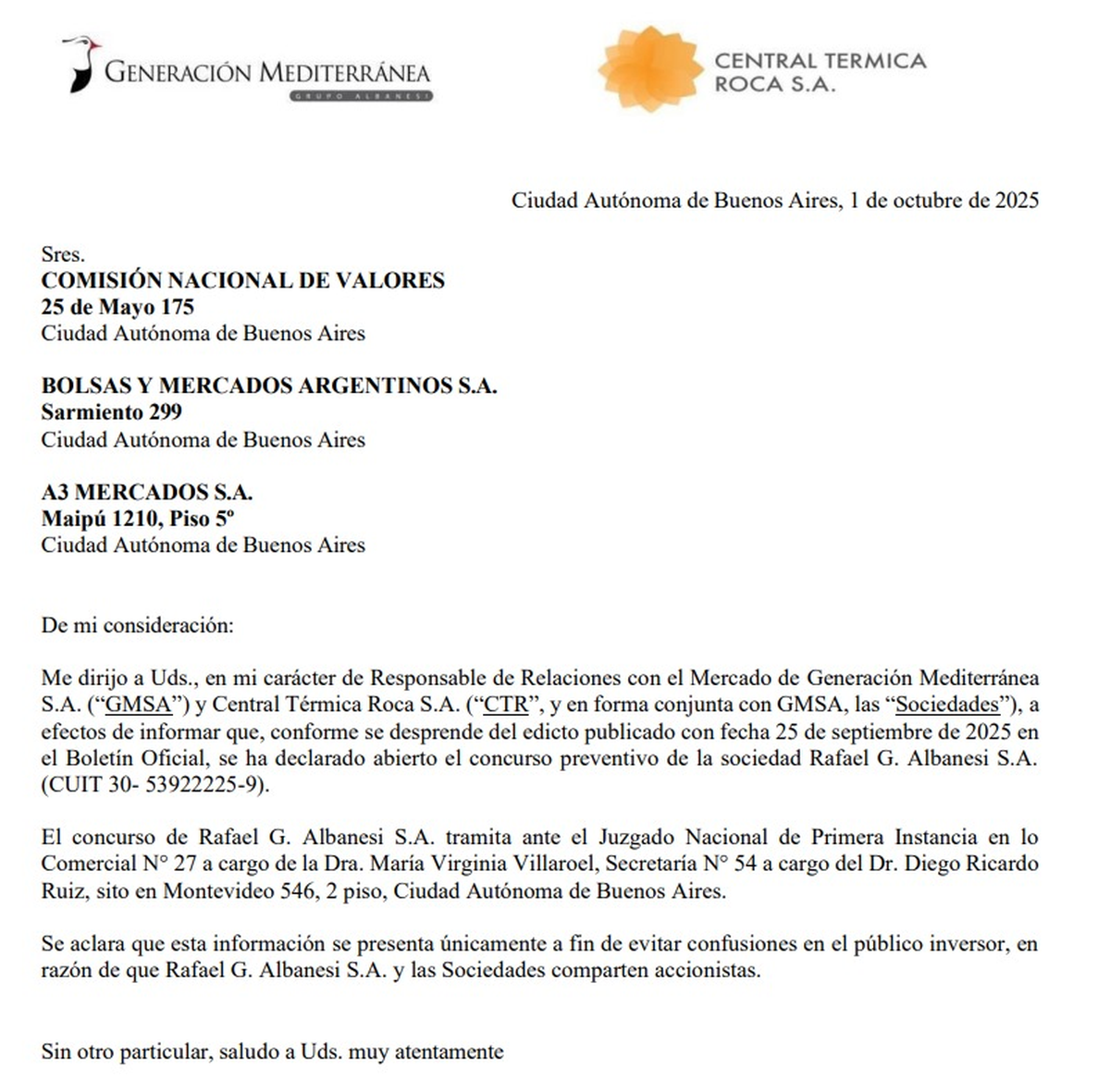 El Grupo Albanesi enfrenta su momento más delicado en décadas. A través de dos comunicaciones oficiales dirigidas a la Comisión Nacional de Valores, Bolsas y Mercados Argentinos y A3 Mercados, Generación Mediterránea S.A. (GEMSA), Central Térmica Roca S.A. (CTR) y Albanesi Energía S.A. confirmaron la apertura del concurso preventivo de la sociedad Rafael G. Albanesi S.A. (RGA), tal como se desprende del edicto publicado el 25 de septiembre en el Boletín Oficial.