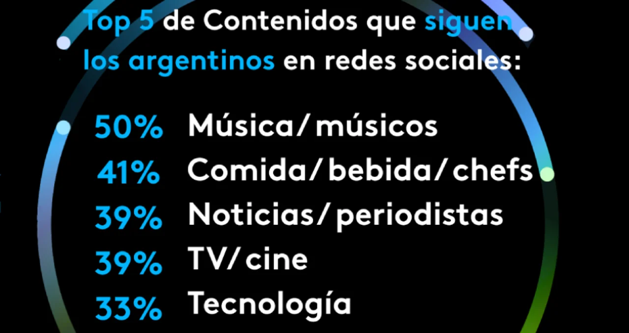 - Los principales contenidos que consumen los argentinos: el 50% música, 41% comida, 39% noticias, 39% cine/televisión y 33% tecnología.